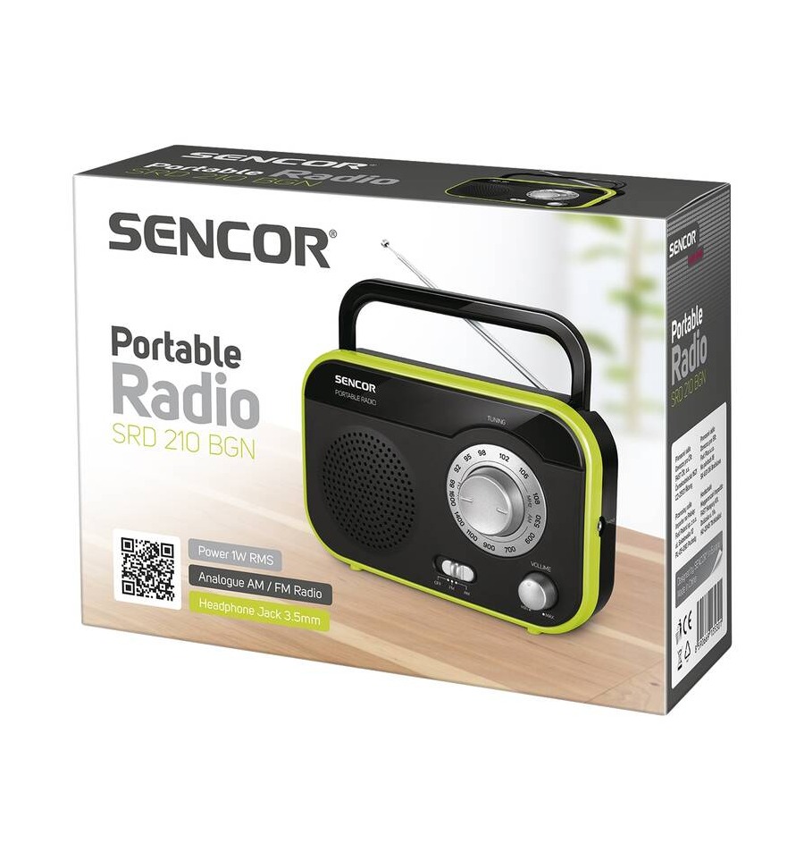 Přenosný radiopřijímač Sencor SRD 210 B černý • analogový • teleskopická anténa • integrovaný reproduktor • výstup na sluchátka • příkon 1 W • hmotnost 0,6 kg • rozměry 5,3 × 13,9 × 21 cm (š × v × h)