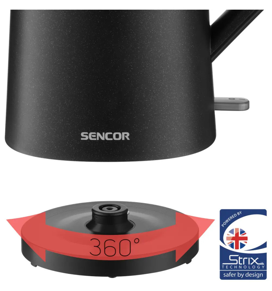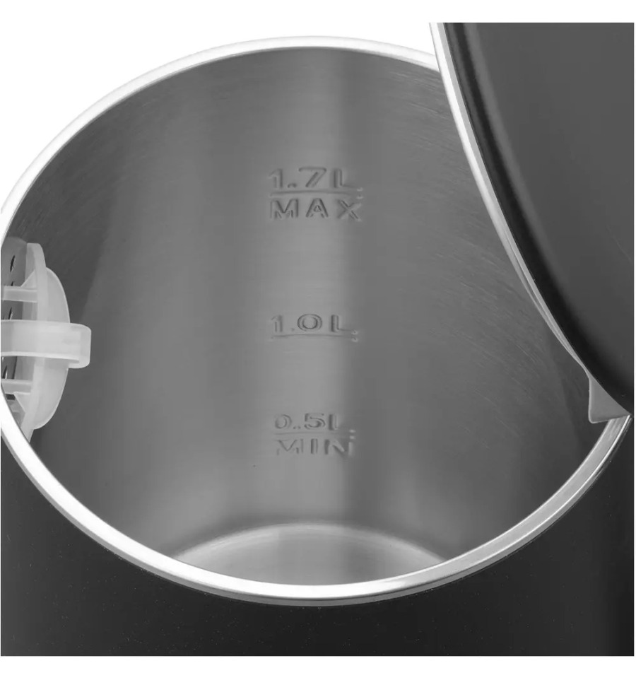Rychlovarná konvice • objem 1,7 l • vyjímatelný nerezový filtr • skryté topné těleso • otevření víka 90° • 360° kruhová základna • protiskluzové nožičky • podsvícený vypínač • automatické vypnutí