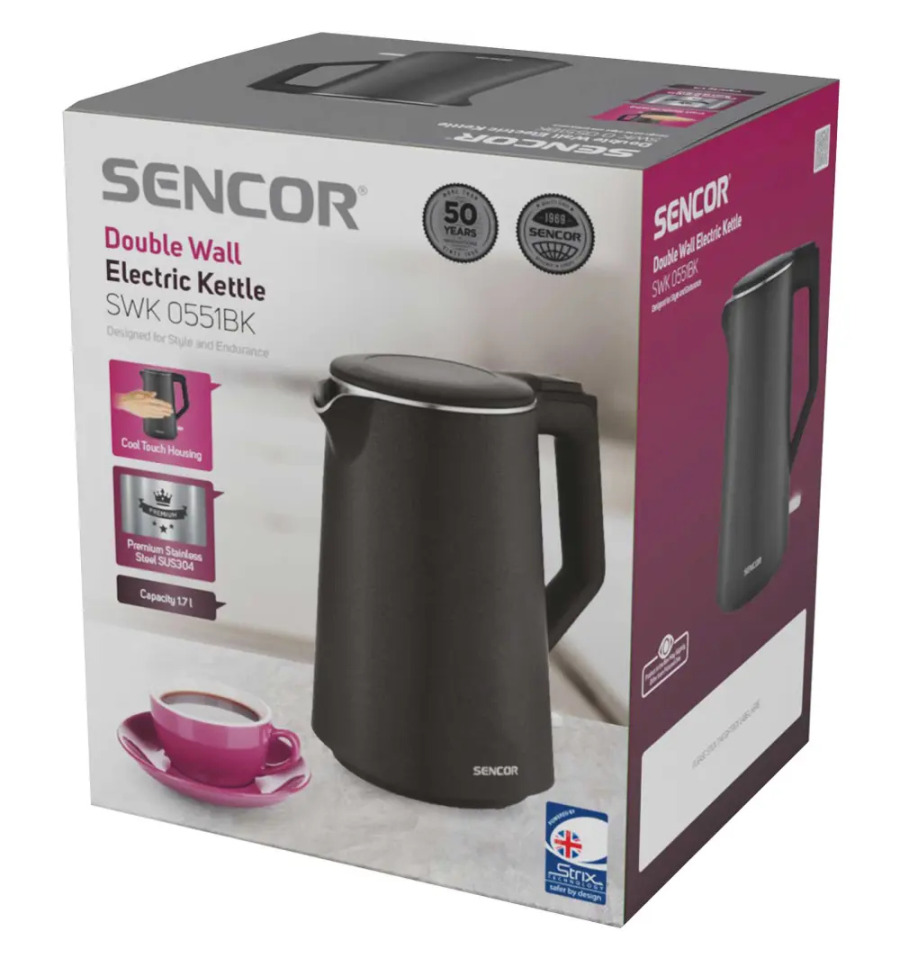 Konvice s příkonem 2200W a objemem 1,7 l v nerezovém provedení je v hodná do moderních i retro designových kuchyní. Má automatický systém, který vypne konvičku při dosažení bodu varu a bezpečnostní systém, který zajistí aktivaci pojistky v případě, že hrozí přehřátí konvičky, nebo v případě, že v konvici není voda.